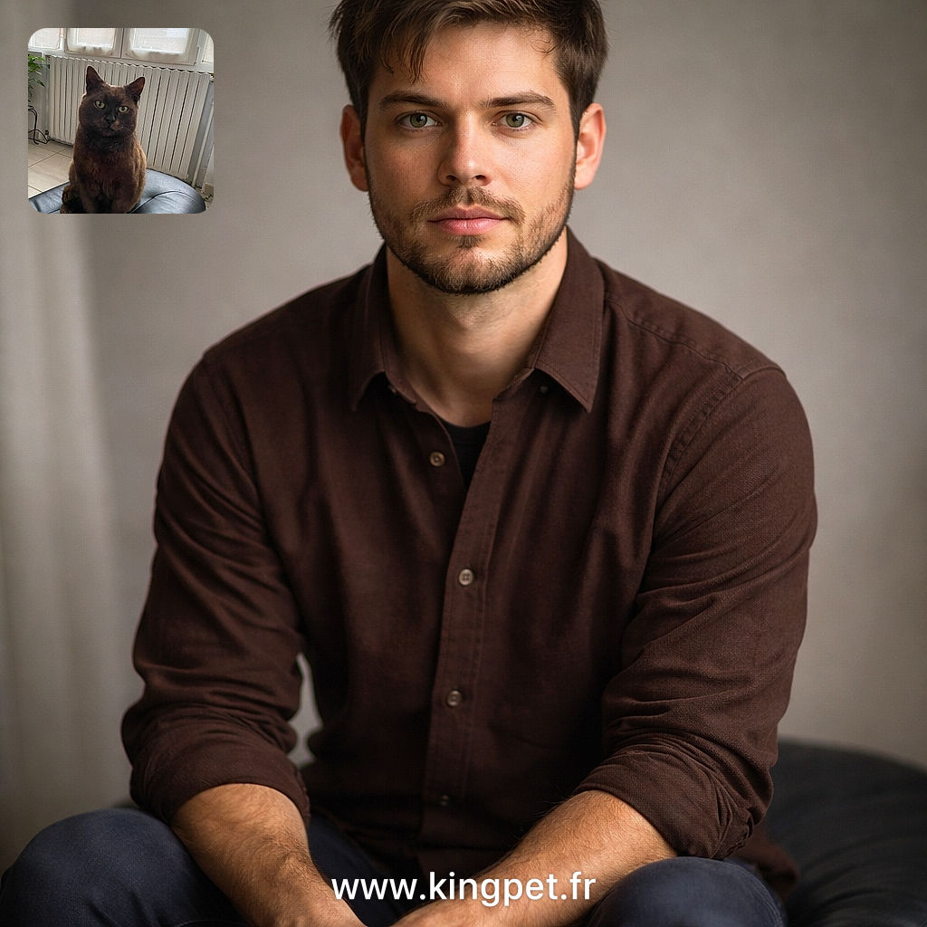 • A charming brown cat sits regally on a black leather surface, with a softly lit window and radiator in the background, giving off an air of quiet dignity and curiosity.