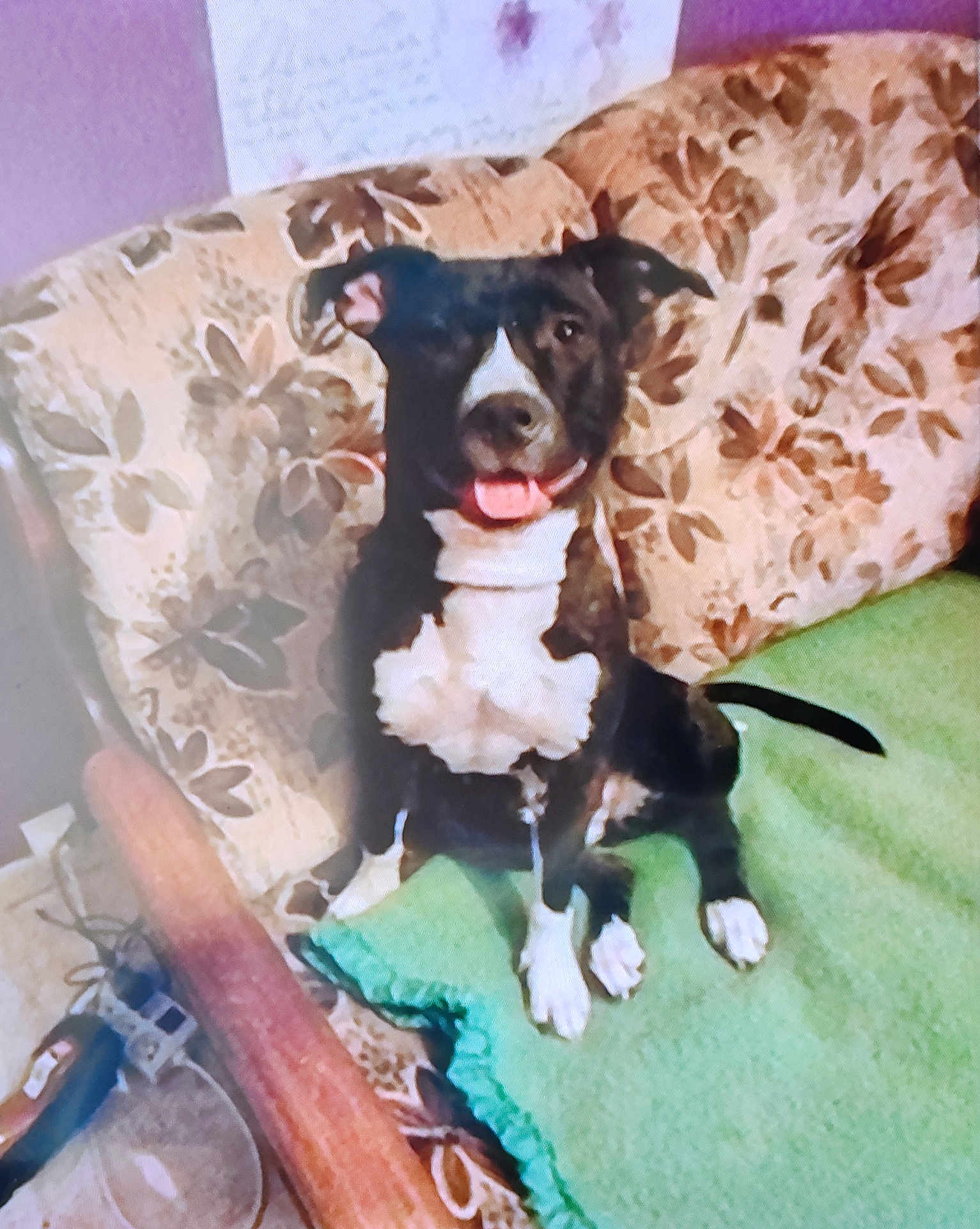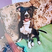 • Inaya a rejoint le concours — aidez-le/la à gagner de superbes lots ! dog, black_and_white, sitting, tongue_out, couch, floral_pattern, blanket, indoor, home, pet, happy, animal, furniture, wall, purple_wall, paper, domestic, canine, cozy, living_room