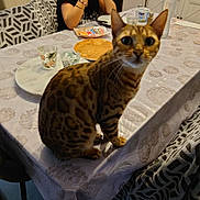 • Nala a rejoint le concours — aidez-le/la à gagner de superbes lots ! cat, table, dining_table, person, glass, plate, food, tablecloth, indoor, furniture, pattern, animal, pet, curious, seated, brown, spotted, meal, kitchen, domestic
