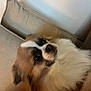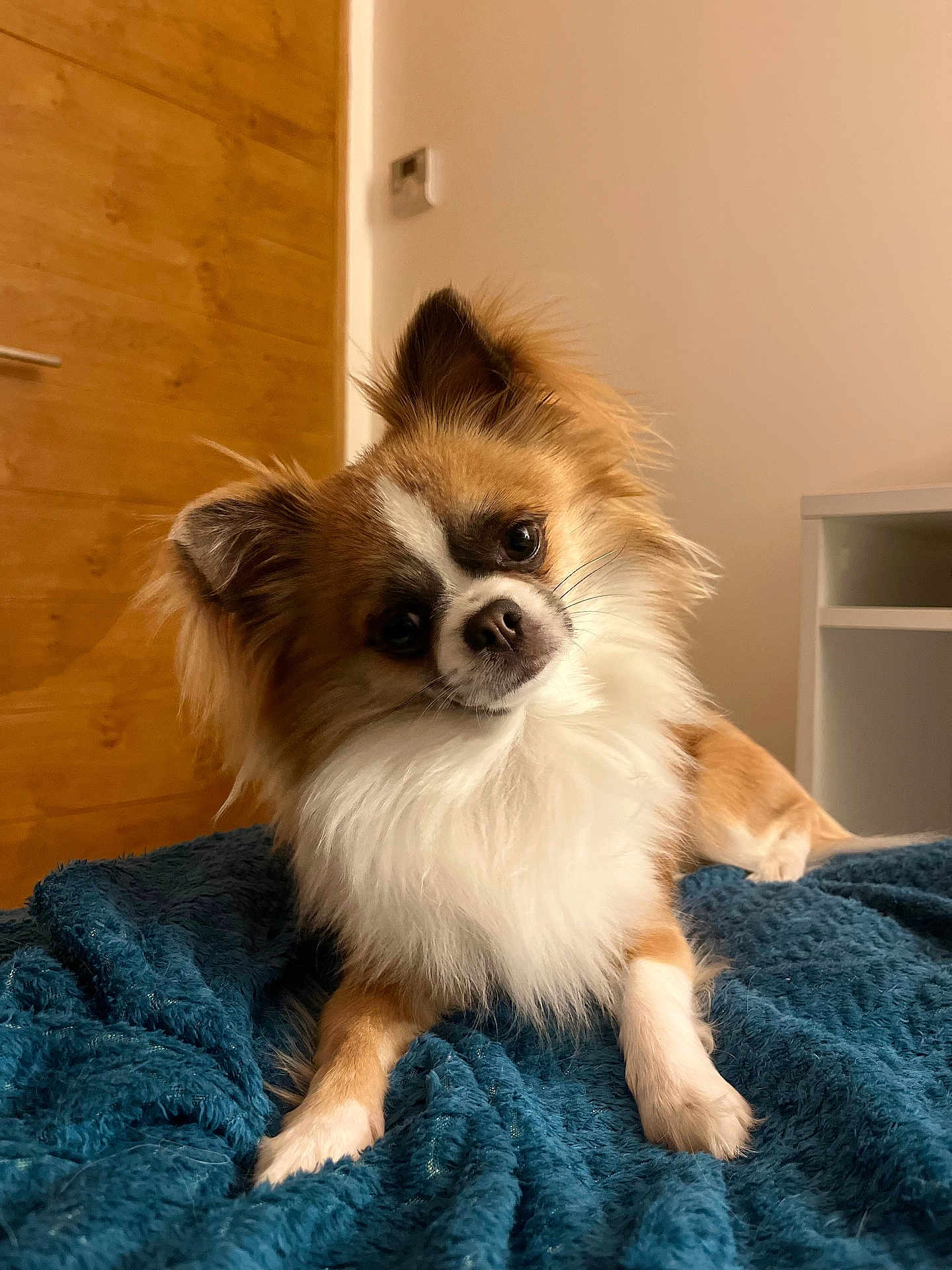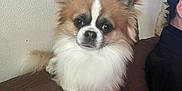 • Odin a rejoint le concours — aidez-le/la à gagner de superbes lots ! dog, small_dog, fluffy_dog, brown_couch, chew_bone, indoor, pet, animal, white_fur, tan_fur, ears, face, paw, looking_at_camera, person_partial, cap, casual_clothing, home, relaxed, closeup