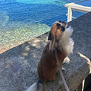 • Odin a rejoint le concours — aidez-le/la à gagner de superbes lots ! dog, leash, stone_ledge, sea, water, outdoor, sunlight, tail, fur, pet, calm, nature, animal, daytime, coast, blue, brown, white, small_dog, scenic