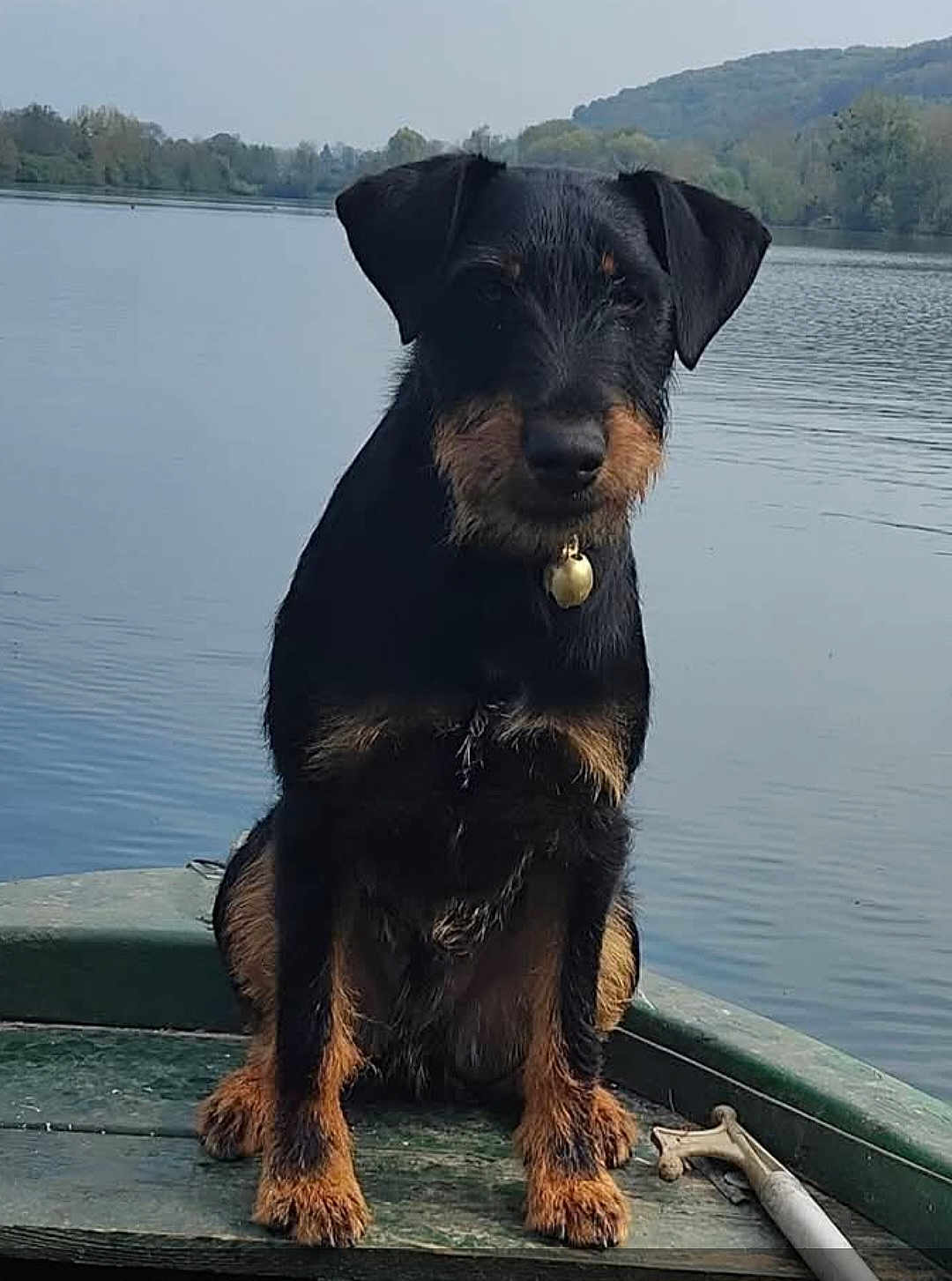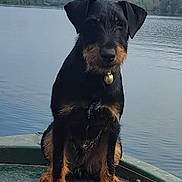 • Voyou participe au concours pour gagner de l'argent avec cette photo : dog, black_dog, tan_dog, boat, lake, water, nature, outdoor, collar, bell, trees, hills, calm, pet, animal, sitting, wooden_boat, canine, adventure, peaceful